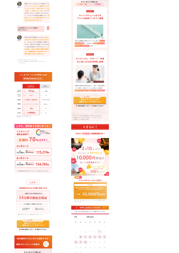 ランディングページ制作 2025年8月17日 最終更新日時 : 2025年8月18日 portfolio 【製作時間】20時間【使用ソフト】Photoshop・illustrator・Figma・HTML・CSS・jquery【担当業務】デザイン・実装【意識した亊】スクロール離脱を防ぐためjqueryで動きをつけたLPを作成しました。